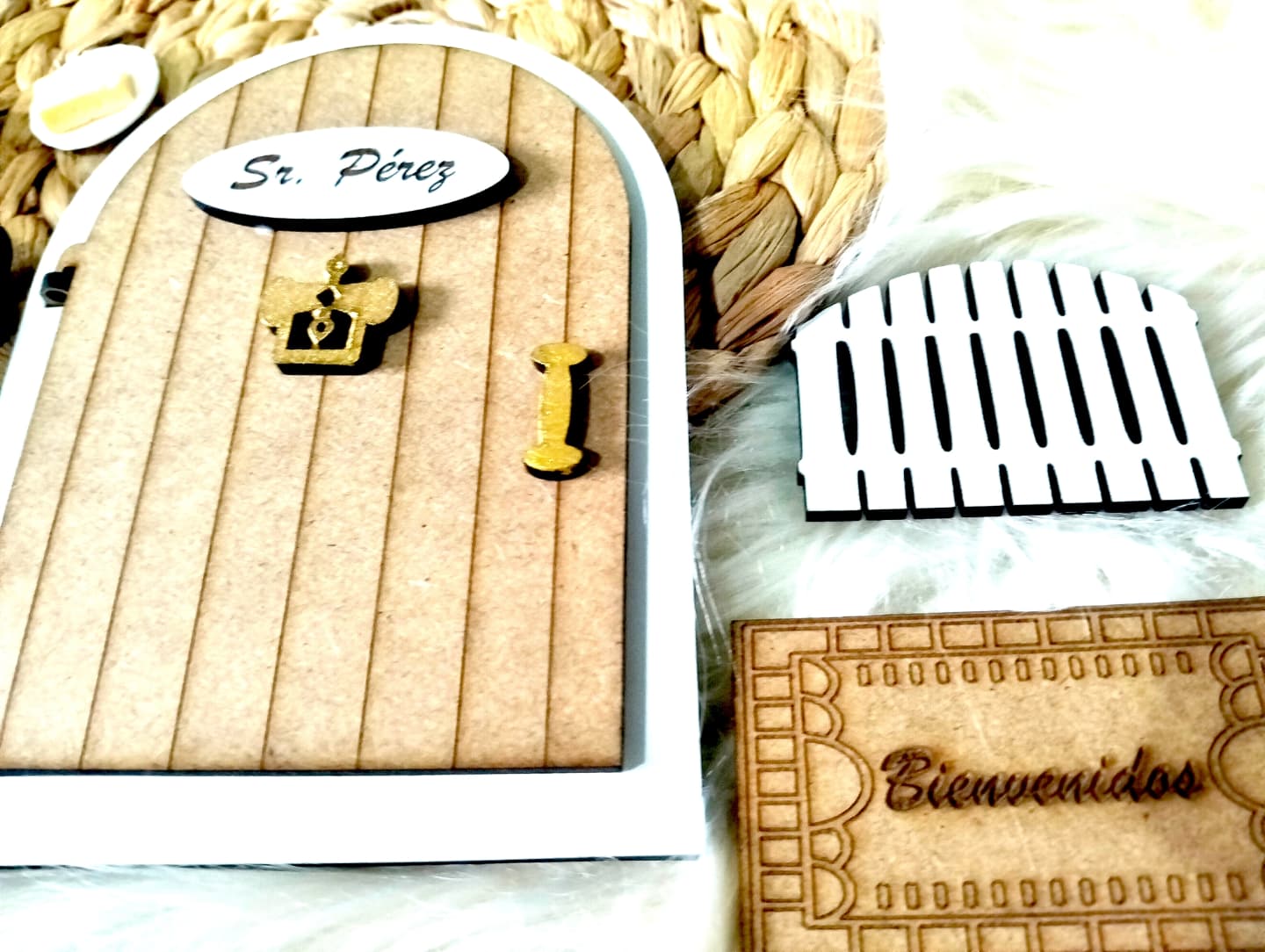 La puerta del Ratoncito Pérez es perfecta para colocar en la habitación de los más pequeños de la casa. Está fabricada en madera Cuando a nuestros hijos se les cae un diente, el Ratoncito Pérez les hace una visita para dejarles un regalo debajo de la almohada. Por eso, para poder acceder al diente de leche y realizar el intercambio, el Ratoncito Pérez necesita acceder al dormitorio a través de la Puerta del Ratoncito Pérez. ¡Es mágico! ¡Elige tu color de fondo! La Puerta Mágica tiene un precioso acabado en madera pero puedes cambiar el color del marco de la puerta, las escaleras y la valla. ¡Se te ha caído un diente, apúntalo! Llega ese día tan especial, ha caído otro diente, apunta la fecha y qué diente es, guarda toda la información perfectamente ordenada y crea un recuerdo único. Este kit incluye: – Puerta mágica – 1 Valla – Letrero con nombre personalizado – Plato con quesito – Escalera – Buzón para el diente – 8 certificados de recogida – Adhesivo para colocarlo donde quieras Pack 2 niños También tienes la posibilidad de añadir a un segundo niño al pedido. El pack 2 niños incluye un letrero con el nombre del niño y 8 certificados de recogida más.