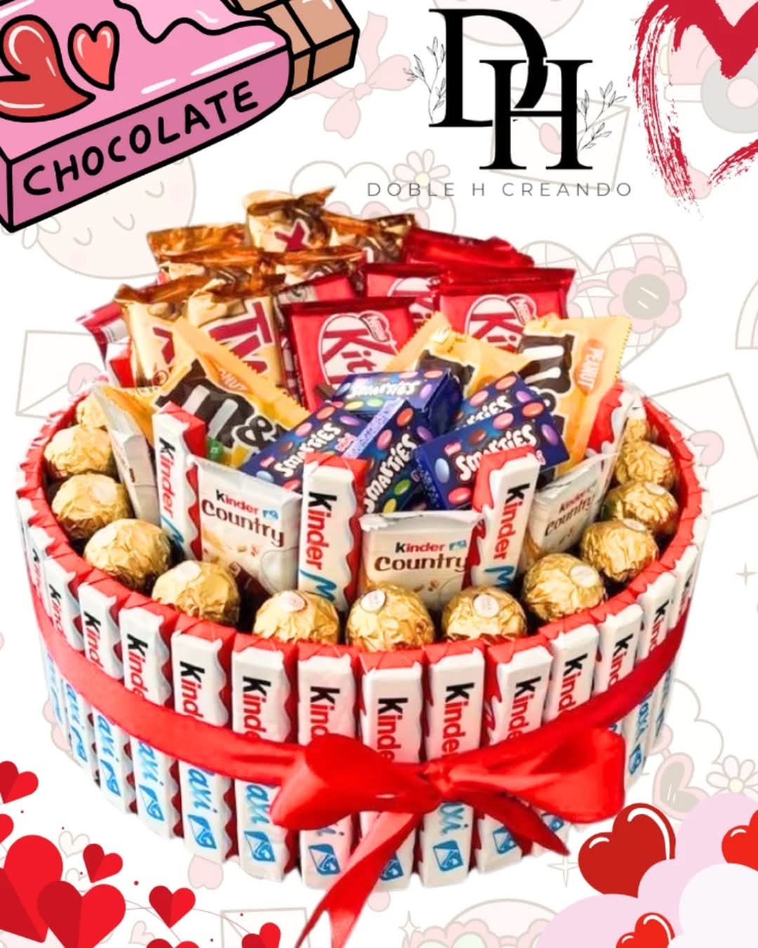 Tarta de Chocolatinas Kinder Personalizadas ¡El regalo perfecto para los amantes del chocolate! Nuestra tarta de chocolatinas Kinder no es un bizcocho, sino una original y deliciosa tarta hecha completamente con chocolatinas Kinder,presentada de forma elegante y llamativa. Tú eliges como la quieres: selecciona tus chocolatinas Kinder favoritas (Kinder Bueno, Schoko-Bons, Kinder Chocolate, Happy Hippo,Kinder sorpresa y más) y personaliza los colores de los lazos para que se adapte a la ocasión. Ideal para cumpleaños, regalos sorpresa, mesas dulces o eventos especiales. Hecha a mano con dedicación, cuidando cada detalle para que sorprendas y endulces a lo grande. ¡Haz tu pedido hoy y crea tu propia tarta Kinder a medida! ( También se puede realizar con mix de otras marcas )