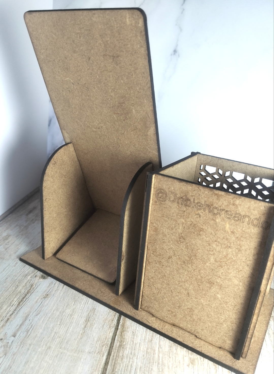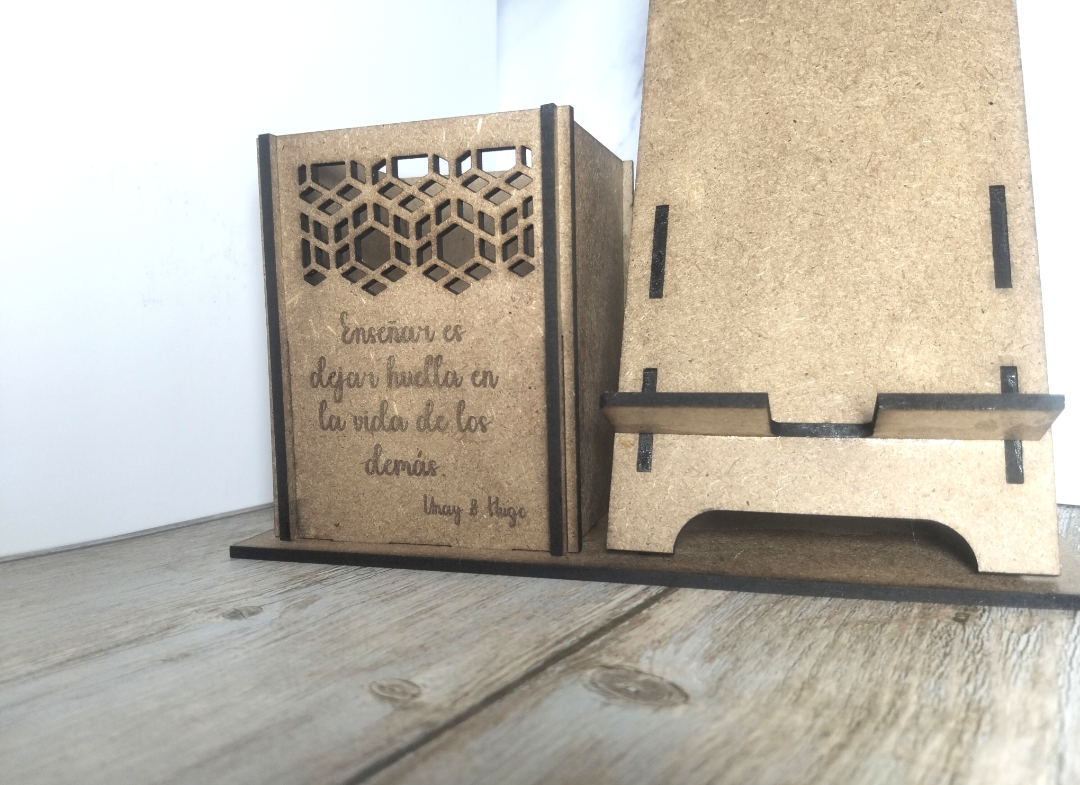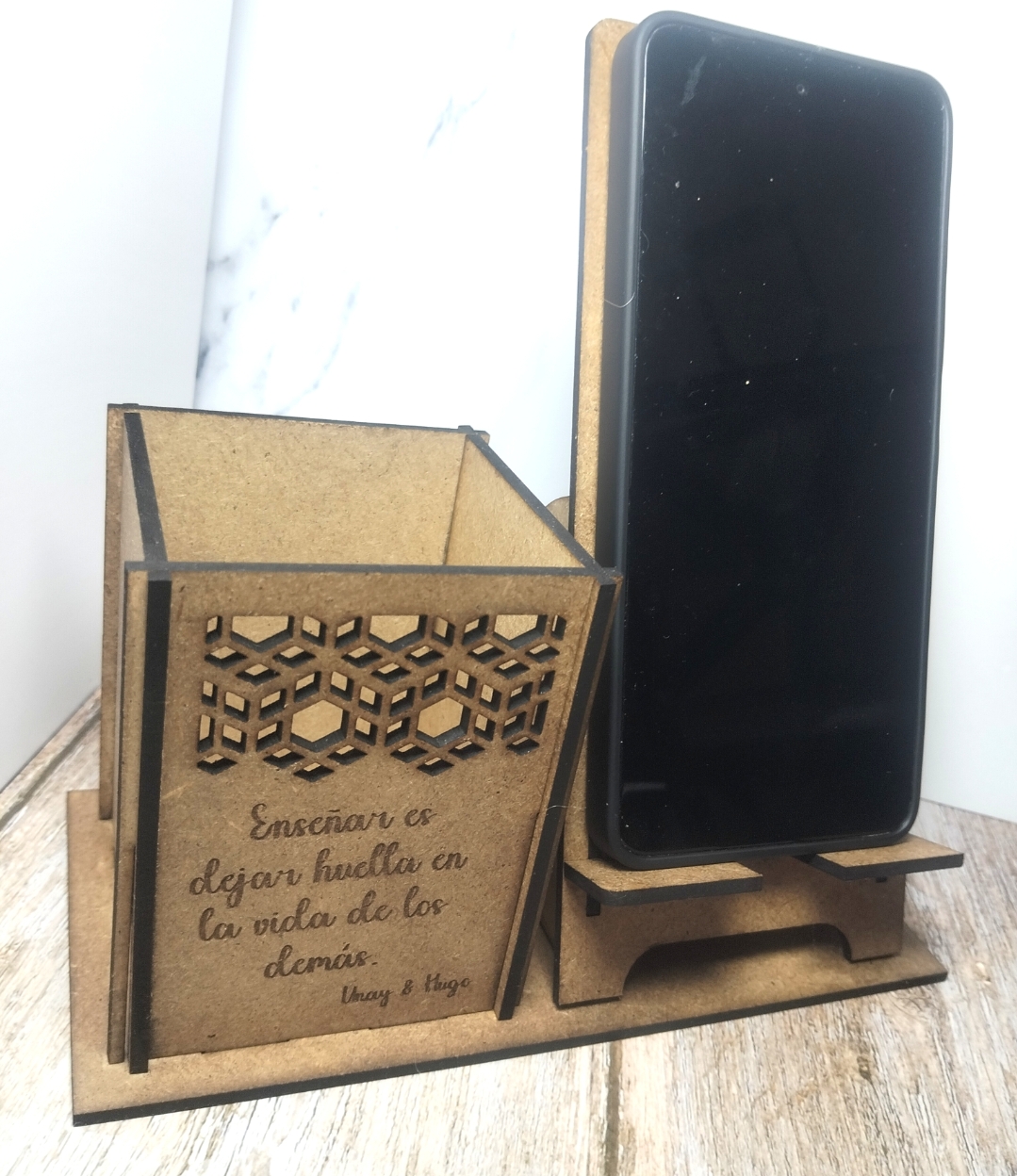 Organiza tu escritorio con estilo gracias a este elegante set de portamóvil y lapicero de madera. Con un diseño moderno y detalles decorativos en corte láser, este producto es ideal como regalo para profesores, profesionales o amantes de lo artesanal. 🔸 Texto completamente personalizable: puedes grabar nombres, frases motivadoras o dedicatorias especiales. 🔸 Incluye: base de madera con soporte para teléfono y compartimento tipo lapicero. Hecho con materiales de alta calidad y diseñado para durar.