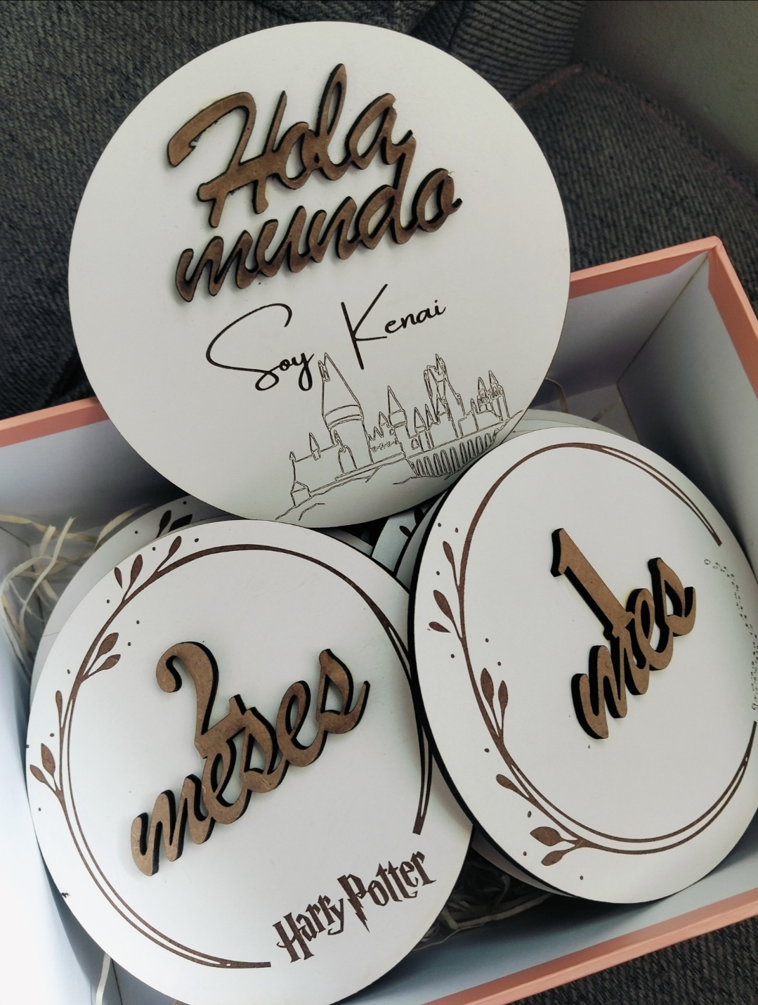 Cumplemeses de Harry Potter 100% personalizado Compuesto por 13 chapas Una de hola mundo Y 12 con los meses hasta llegar al año Realizado 100% en madera