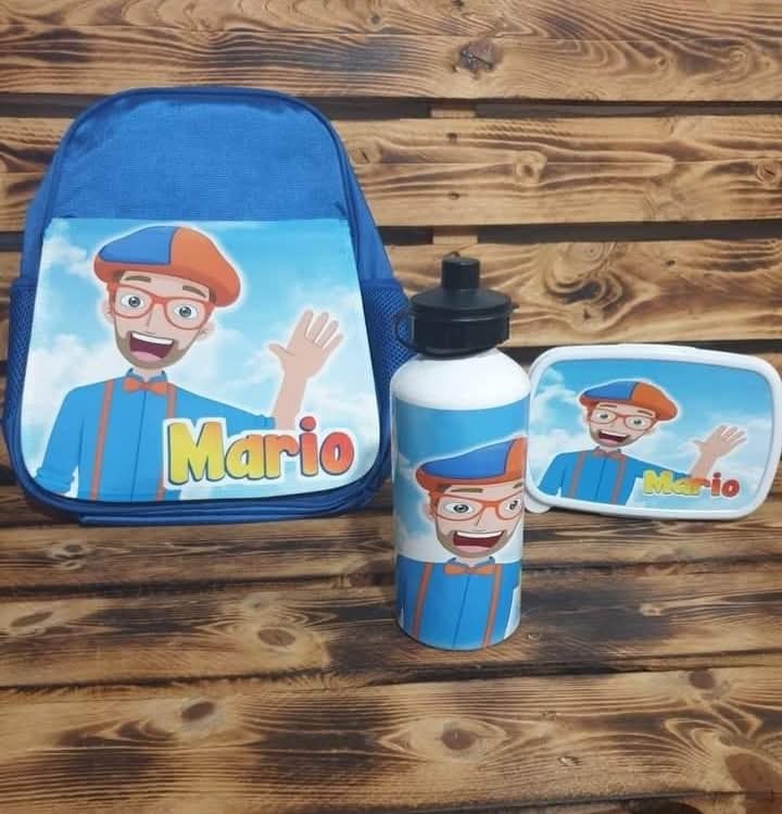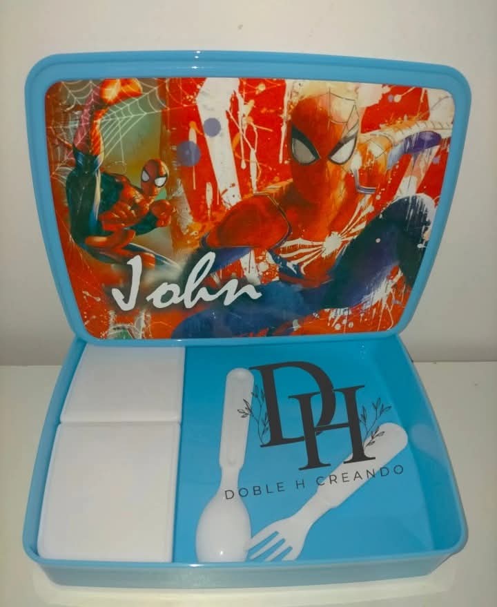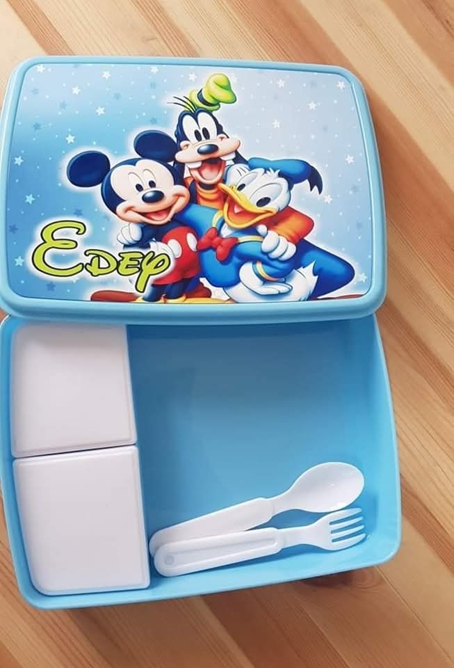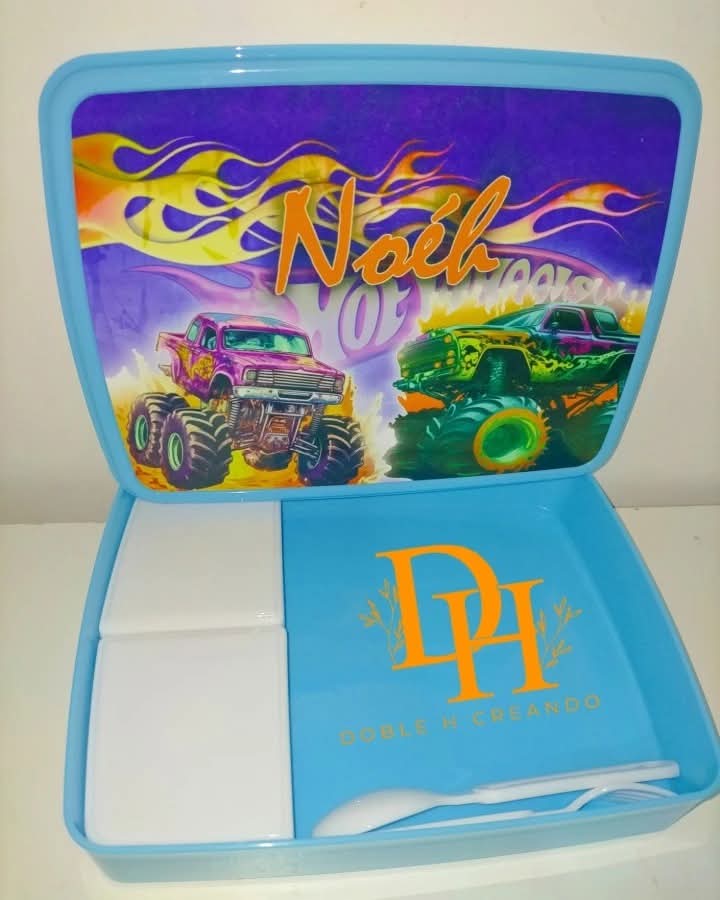 Pack formado por mochila + fiambrera + botella personalizada Mochila: Material Loneta Oxford. Solapa personalizable fabricada en poliéster. Tiene 2 bolsillos laterales con rejilla para poder colocar botellas. Bolsillo en la parte frontal debajo la solapa. Medidas: 28 x 33 x 9 cm. Área personalizable 25 x 23 cm. Ideal hasta los 5 años Fiambrera grande: Fiambreras aptas para consumo alimentario. Libre de BPA 3 compartimentos interiores: 1 grande y 2 pequeños Incluyen 2 contenedores de alimentos de plástico blanco que encajan en los 2 compartimentos pequeños Incluye dos cubiertos, cuchara y tenedor. Medidas: 23 x 18 x 4cm Fiambrera pequeña: Tapa hermética Libre de BPA Apto para lavavajillas Medidas 18,5 x 13 x 6cm Botella de aluminio, 600 ml, incluye dos tapas, una de rosca y otra con dosificador.